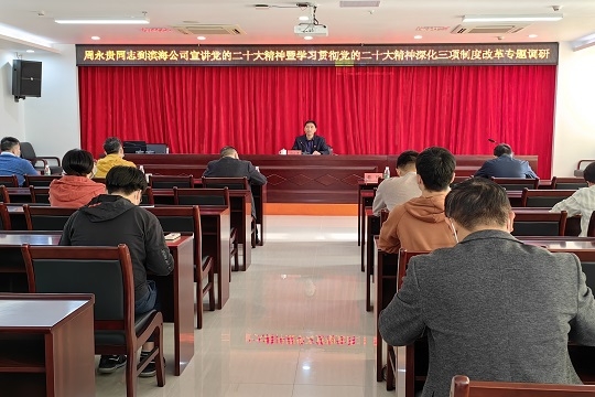 12月8日上午,市城投集團(tuán)黨委書記、董事長(zhǎng)周永貴到掛點(diǎn)聯(lián)系的下屬濱海公司宣講黨的二十大精神,并就學(xué)習(xí)貫徹黨的二十大精神深化三項(xiàng)制度改革開(kāi)展專題調(diào)研。濱海公司全體黨員干部職工參加宣講會(huì)及專題調(diào)研。周永貴結(jié)...